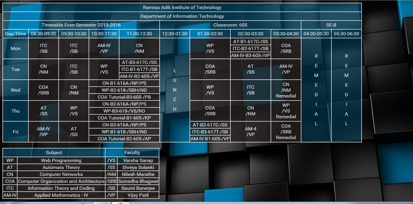 <th colspan=5>Timetable Even Semester 2015-2016</th>